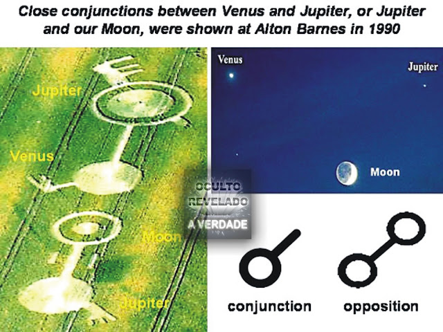 Conjunções planetárias entre Vênus, Júpiter e a Lua, mostrados nesse Crop Circle de 1990.
