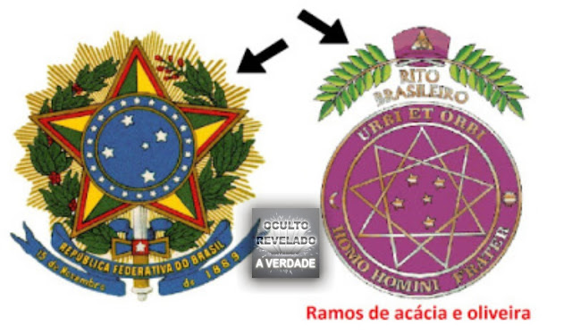 No brasão da republica Brasileira segundo pesquisas que realizei, é usado uma coroa de ramos de café um florescido e o outro não, porem a parte que chama a atenção é que na maçonaria é usado tanto a acácia quanto o ramo de oliveira, veja na imagem acima de uma loja brasileira contém em seu brasão o ramo de acácia. A semelhança com o brasão
